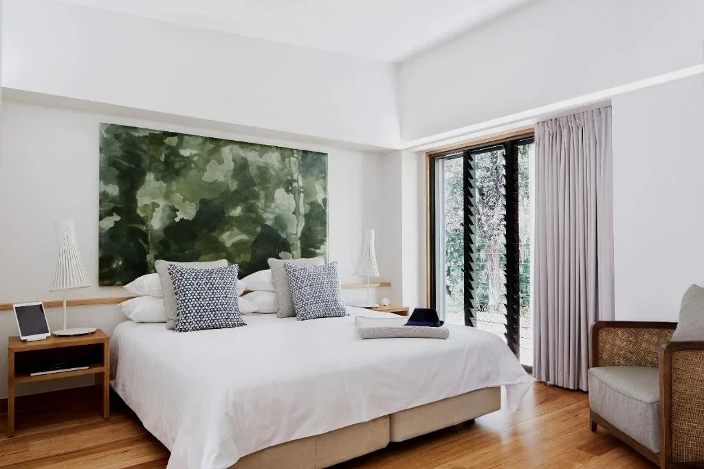 Each villa on the property sits quietly within the landscape, spaced far enough apart to feel private, surrounded by native bushland and soft light filtering through the trees. There was an immediate sense of ease on arrival.