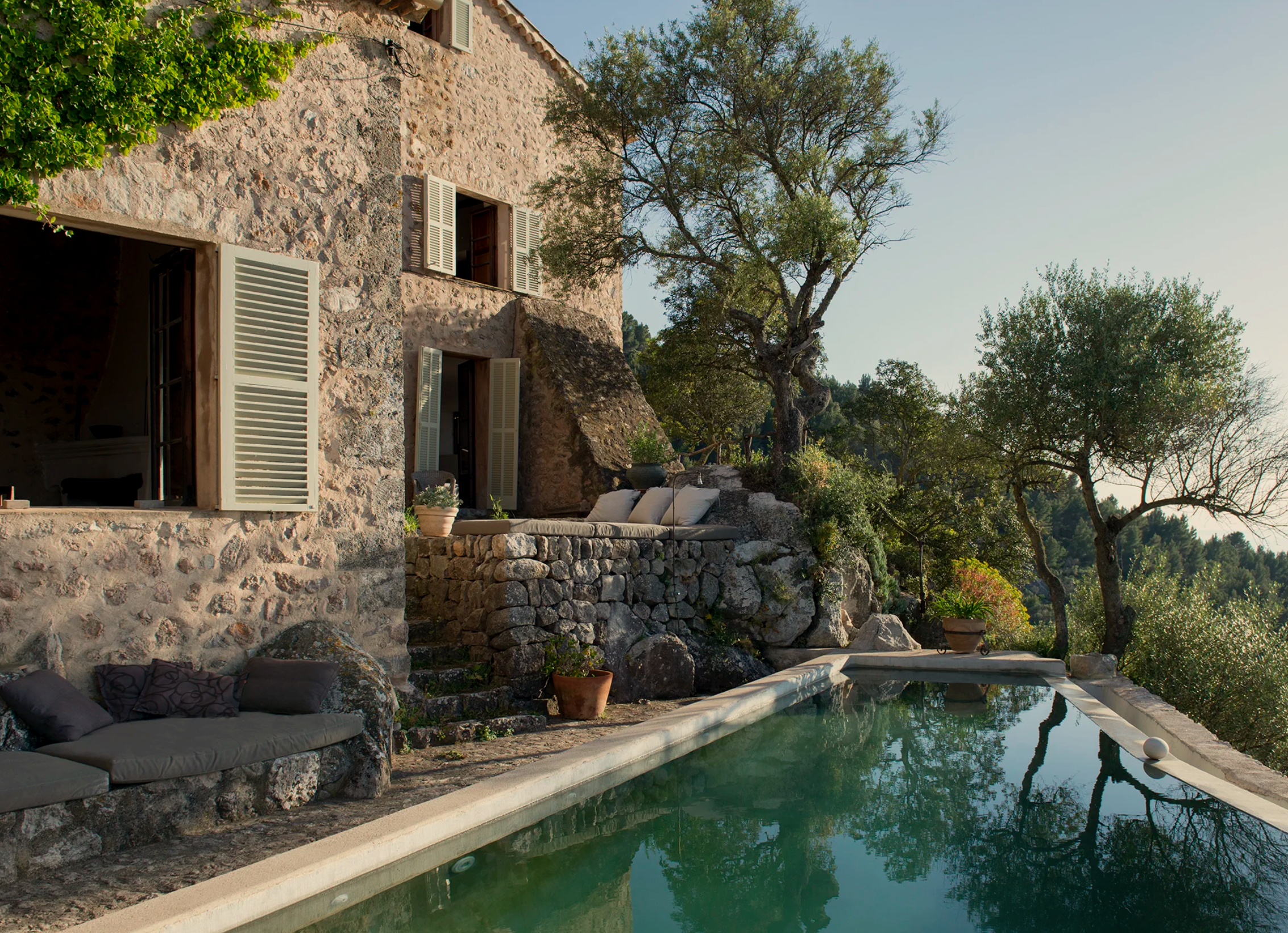 The road to Finca Son Ru climbs through ancient olive groves above the Valldemossa–Deià coast road before revealing the former 13th-century monastery set quietly into the hillside. From here, the north-western coast of Mallorca is in full view with beautiful bays, dramatic cliffs and the Mediterranean ocean.